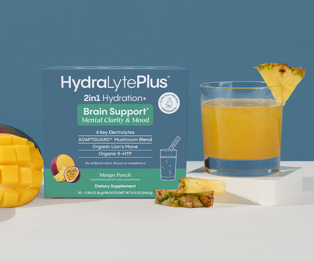 2-in-1 Hydration + brain support formula with electrolytes, organic lions mane, reishi and cordyceps mushrooms and 5-HTP to promote daily mood, mental clarity and sleep quality.